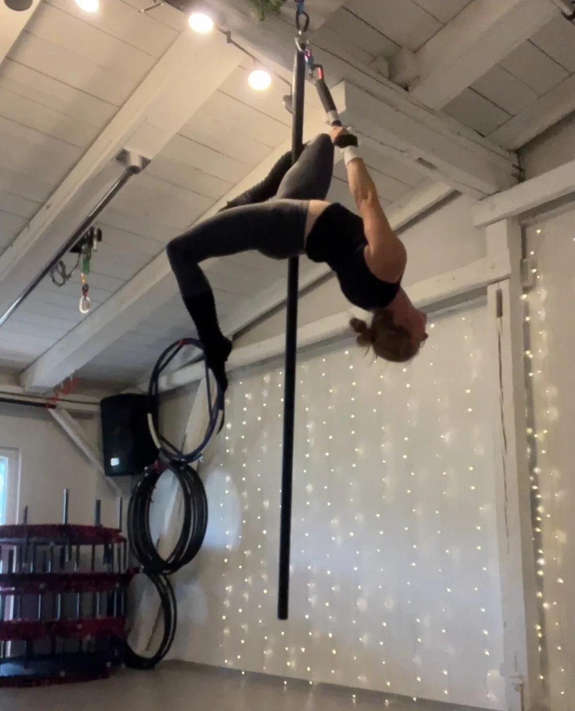 Wir trainieren maximal zu dritt an einer Flying Pole für 75 Minuten inclusive Warm up und cool Down.